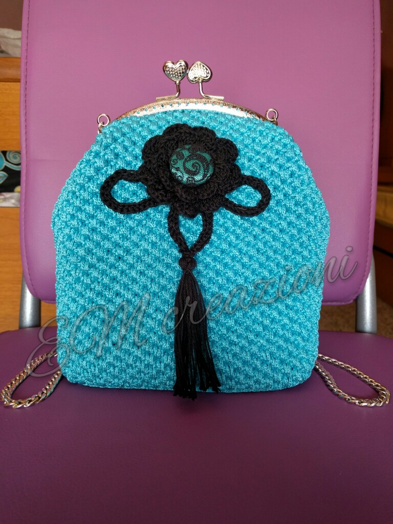 Borsa a spalla/tracolla in cordino thai celeste, realizzata con chiusura clic clac e catena color nikel. Decorazione fiore e nappina in cotone nero con bottone in pizzo.