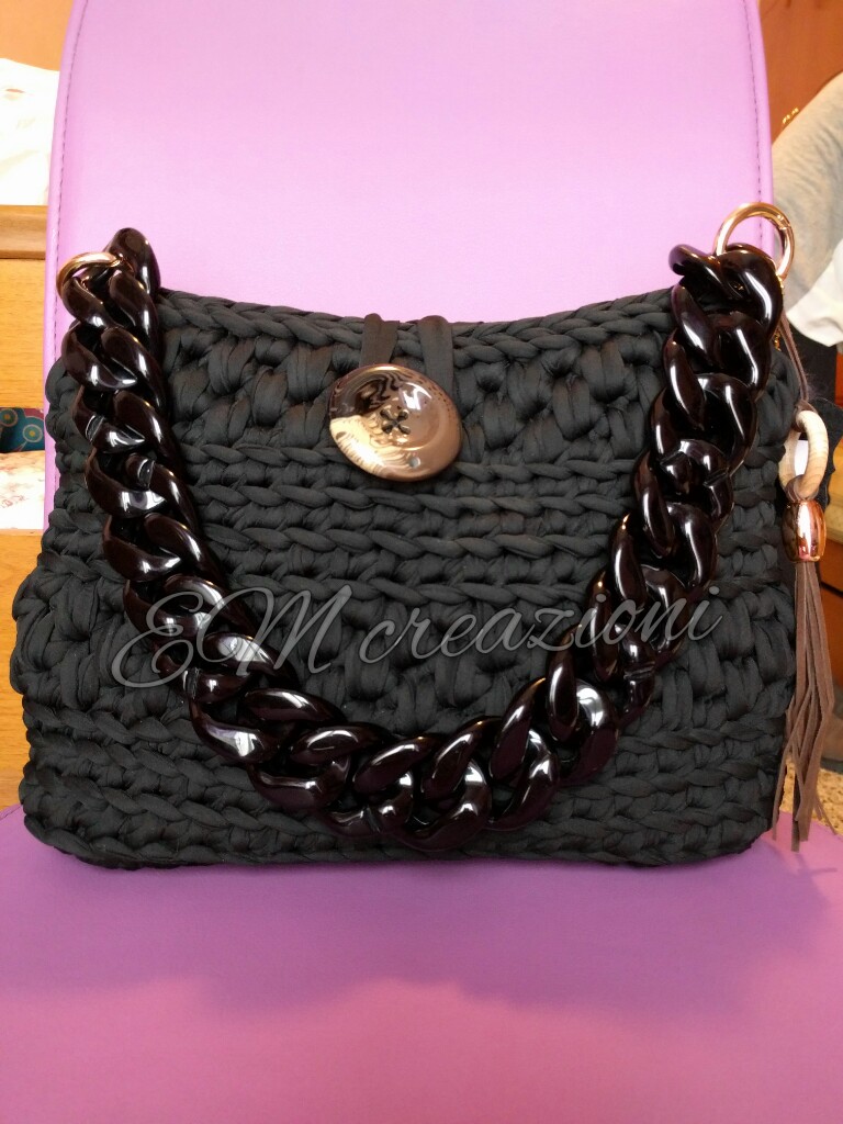 Borsa a spalla realizzata con fettuccia in lycra nera/marrone, con chiusura a bottone in resina variegato e catena in resina nera.Charm nappina fatto a mano con legno e filo in alcantara.