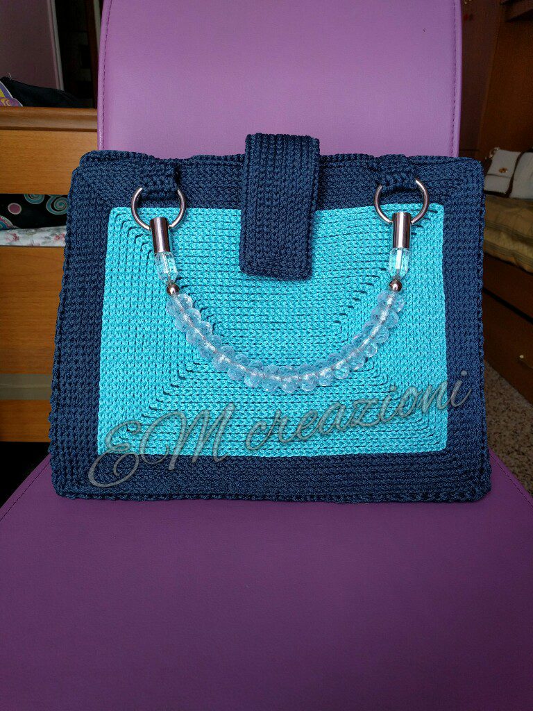 Borsa a mano/spalla realizzata in cordino thai blu e celeste fatta su rete, con manici in plastica con inserti in metallo. Chiusura clip magnetica.