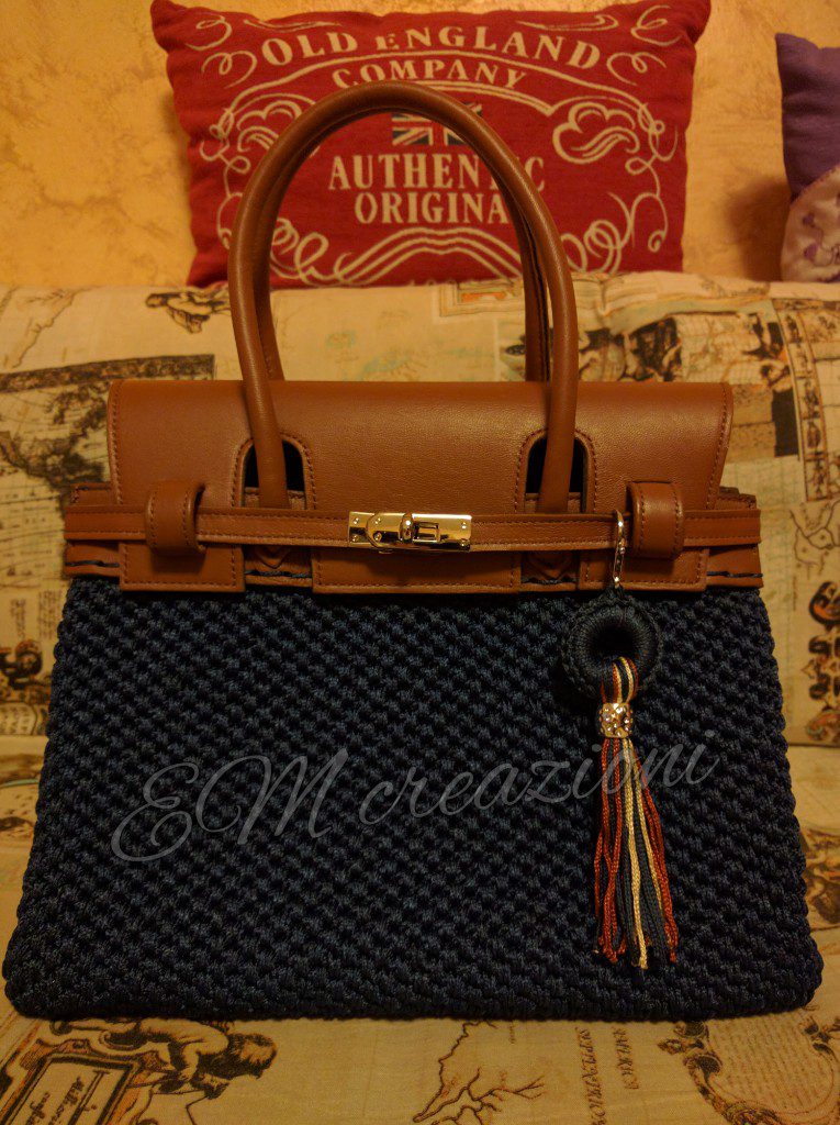 Borsa a mano realizzata in cordino thai blu con kit in pelle color cuoio. Charm nappina fatto a mano in cordino coordinato con inserti in metallo.