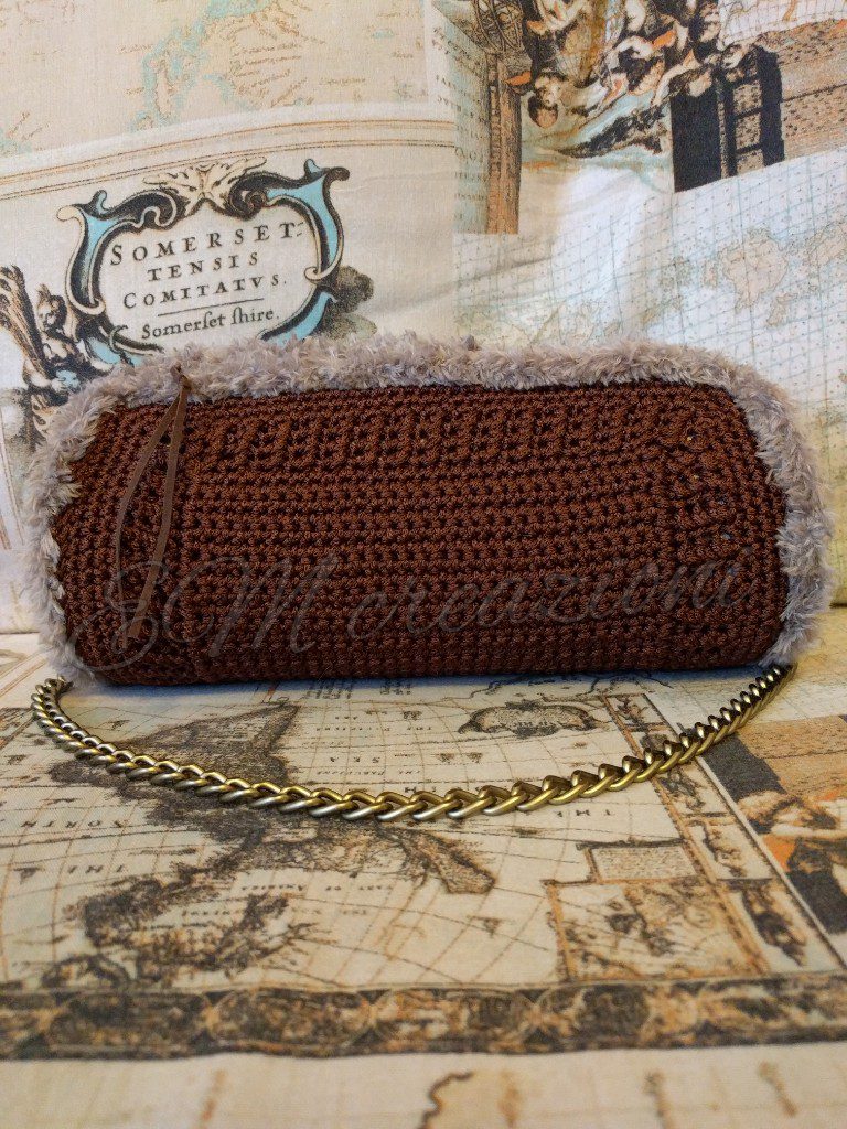 Borsa a tracolla realizzata a mano in cordino marrone e filato in microfibra, chiusura con zip in coordinato e catena bronzo in metallo.