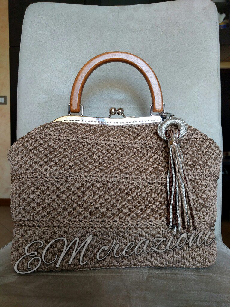 Borsa a mano realizzata in cordino Thai nocciola, chiusura clic clac con manico in legno e charm nappina fatto a mano con cordino variegato e legno.