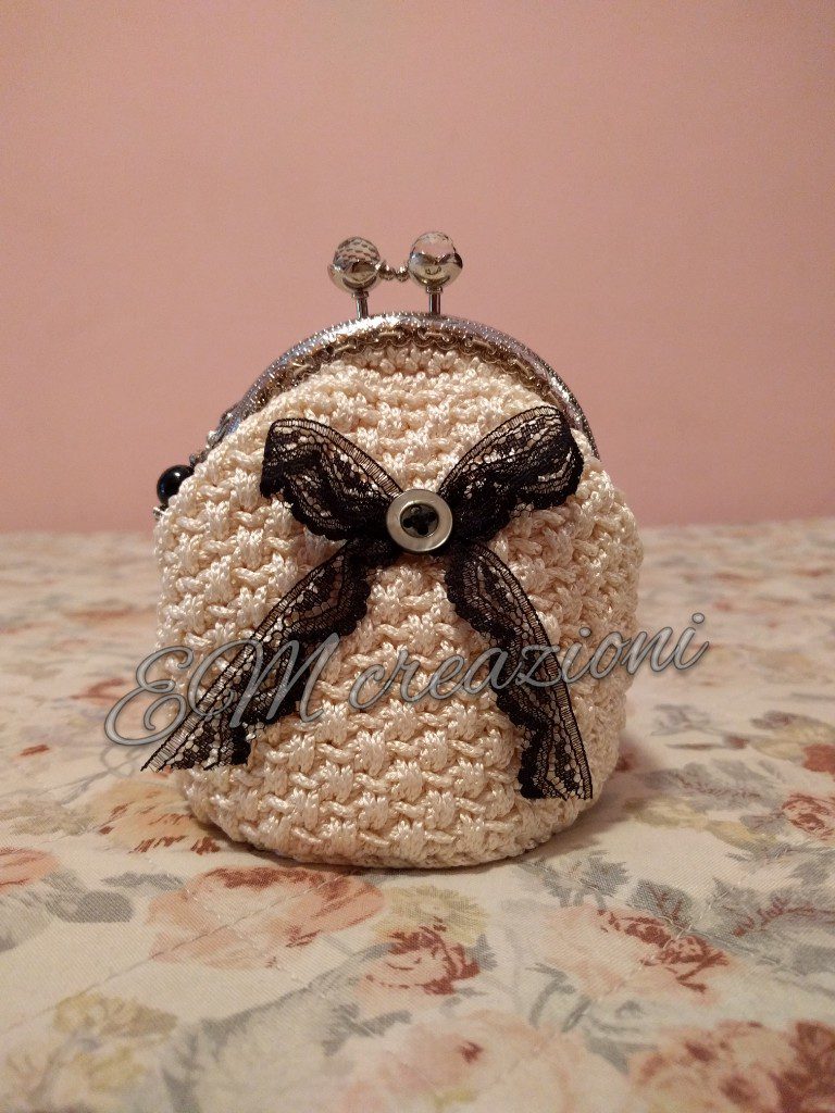 Portamonete realizzato a mano in cordino panna e chiusura a clic clac, decorato con fiocco in pizzo nero e bottone in resina.
