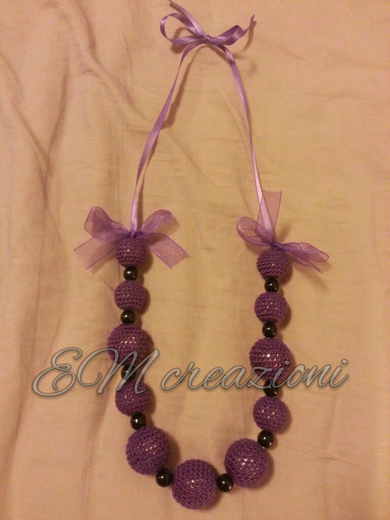 Collana realizzata a mano in cotone viola con sfere in legno rivestite, decorata con inserti in resina nera filo di raso e organza.