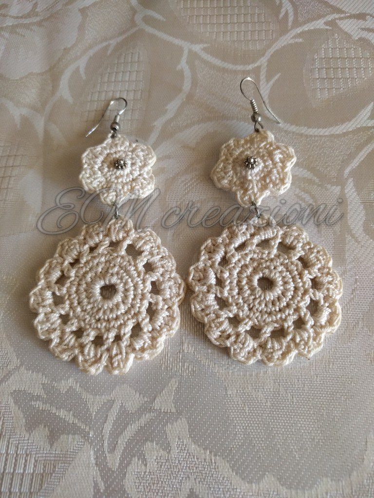 Orecchini realizzati a mano in cotone panna con inserti in metallo.