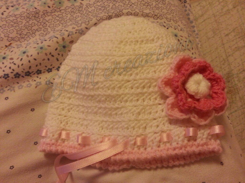 Cappellino per bimba realizzato in pura lana vergine, decorato con nastro di raso rosa e rifinito con fiore fatto a mano.