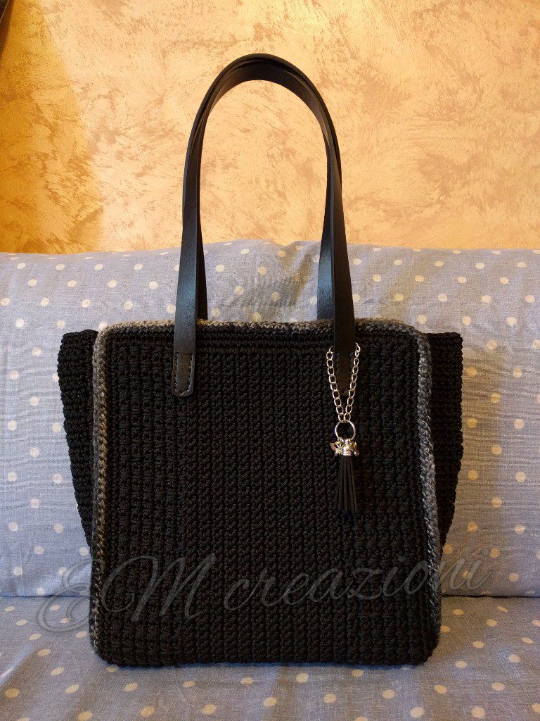Borsa a spalla realizzata a mano in cordino nero e filato in lana variegata, chiusura con clip magnetiche e manici in ecopelle nera.