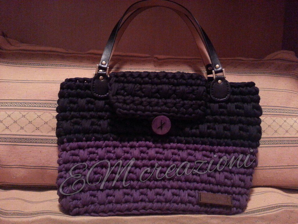 Borsa a spalla realizzata con fettuccia in lycra nera e viola, con manici in ecopelle nero/cuoio chiusura con bottone in resina decorato e targhetta in legno.