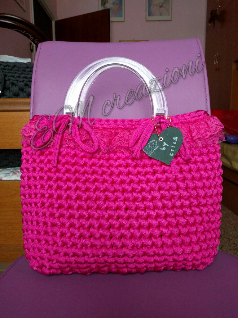Borsa a mano realizzata con fettuccia in lycra rosa e manici in plastica. Chiusura magnetica e finiture in pizzo.